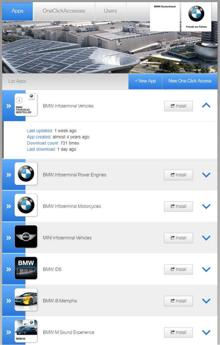 BMW employees use our portal to manually roll out apps on individual devices for specific purposes. After creating limited-time access tokens, a download link to an “official” BMW app is sent via email.