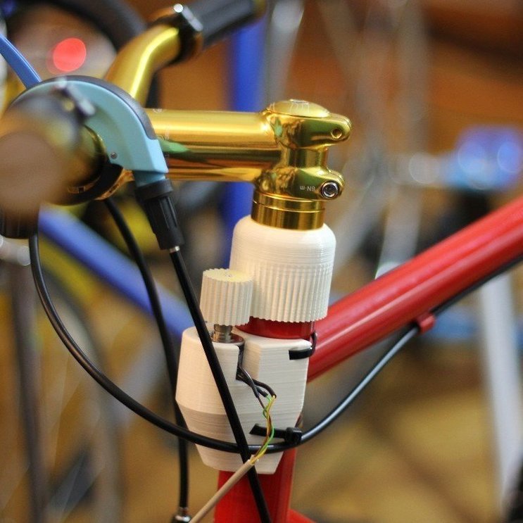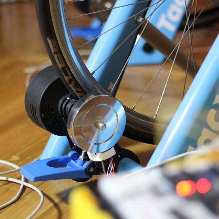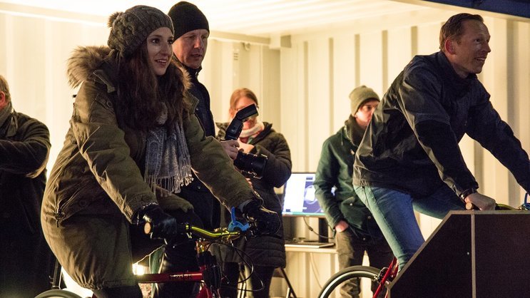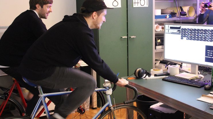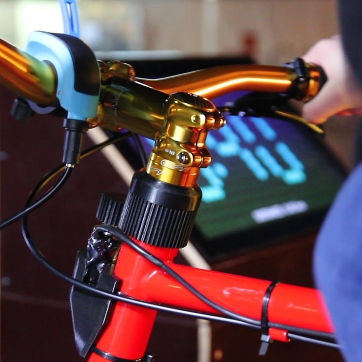 The bicycles’ tires are mounted on bike trainers, allowing the pedaling speed to be captured. The direction of motion is established by a sensor integrated into the handlebar.