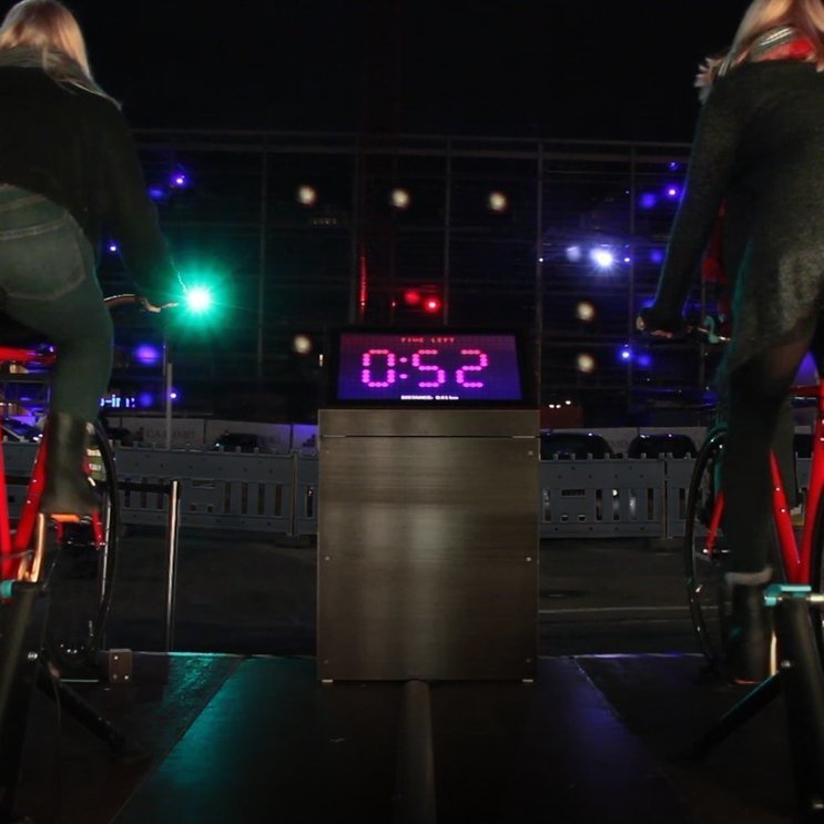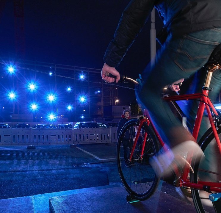 In cooperation with schneider+schumacher, we staged and designed an interactive installation for CA Immo during the 2016 Luminale light festival. A game invites visitors to compete against each other on two stationary bicycles. The game world was projected in real time with 100 motor-controlled floodlights onto the architectural facade of a newly opened parking garage containing Frankfurt’s first bicycle parking garage.