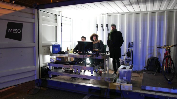 The biking data flows into our specially programmed game engine software and which controls the LED spots. Eventually the facade is bathed in a diffuse light to form a virtual game world while avatars, obstacles, and points move on this background as colored light points.