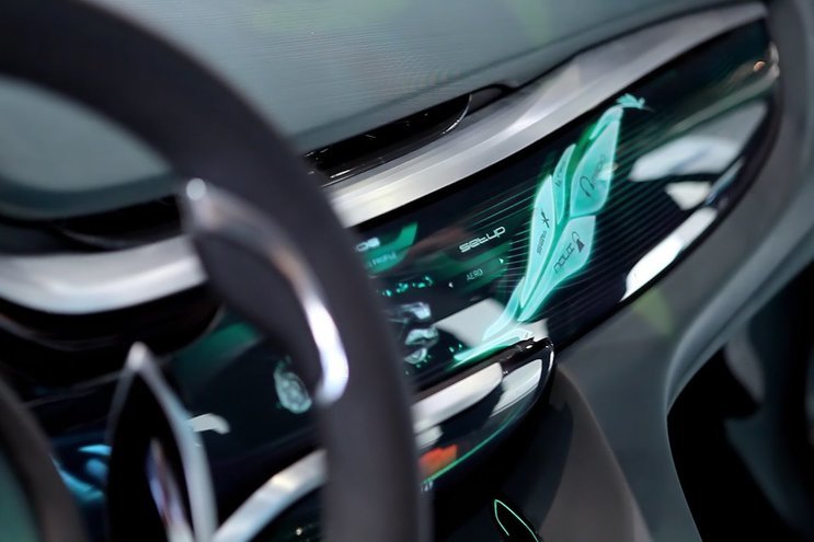 Its double-bent geometry is enhanced by projection mapping. The three interlinked screen areas are combined to address driver and front-seat passenger alike in one holistic experience.