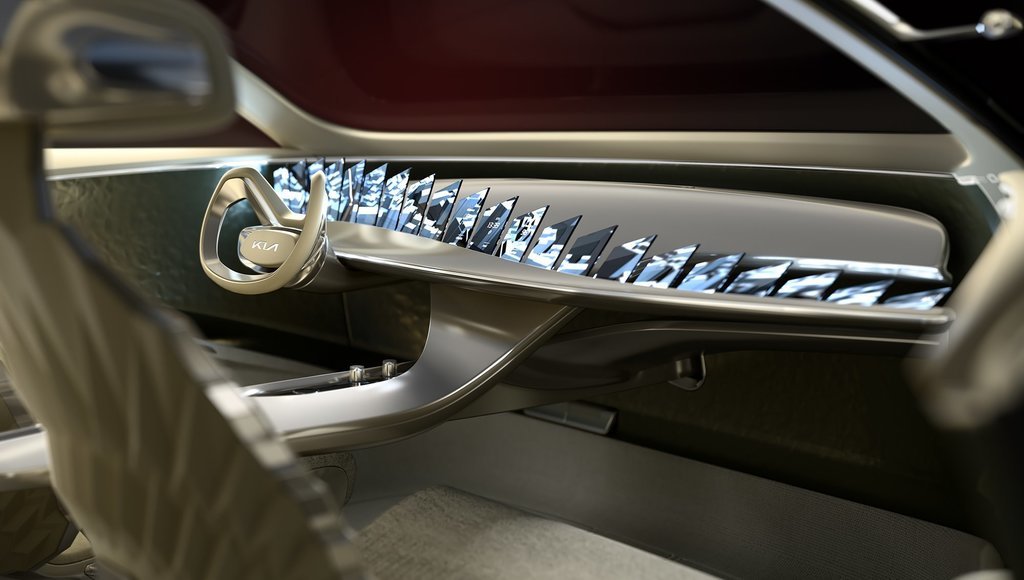 These days, car designers tend to fit vehicles with ever bigger screens, preferably of the largest possible dimension. Kia chose to make an ironic commentary to this automotive trend, with a witty mix of elegance and exaggeration.