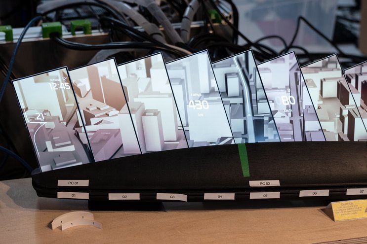 More than a futuristic sculpture, the dashboard serves as the central information interface for climate control, birds-eye navigation and drive and media systems. The fragmentation into individual screens allows for a flexible distribution of graphic content which can either be divided clearly among the segments or spread across the whole array as a single display. Thanks to perfect synchronization, dynamic 3D real-time animations, for example in navigation, can be implemented and arranged across multiple screen without offset.