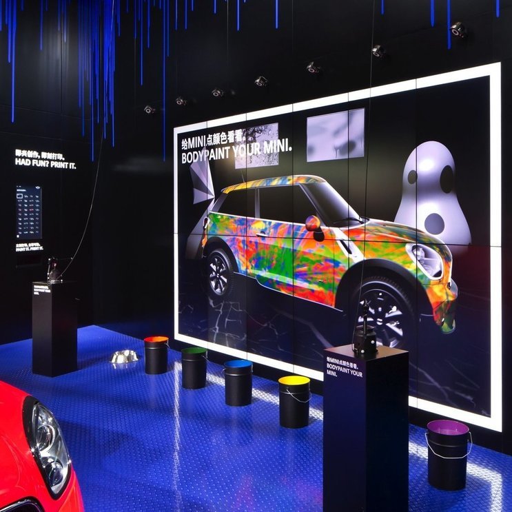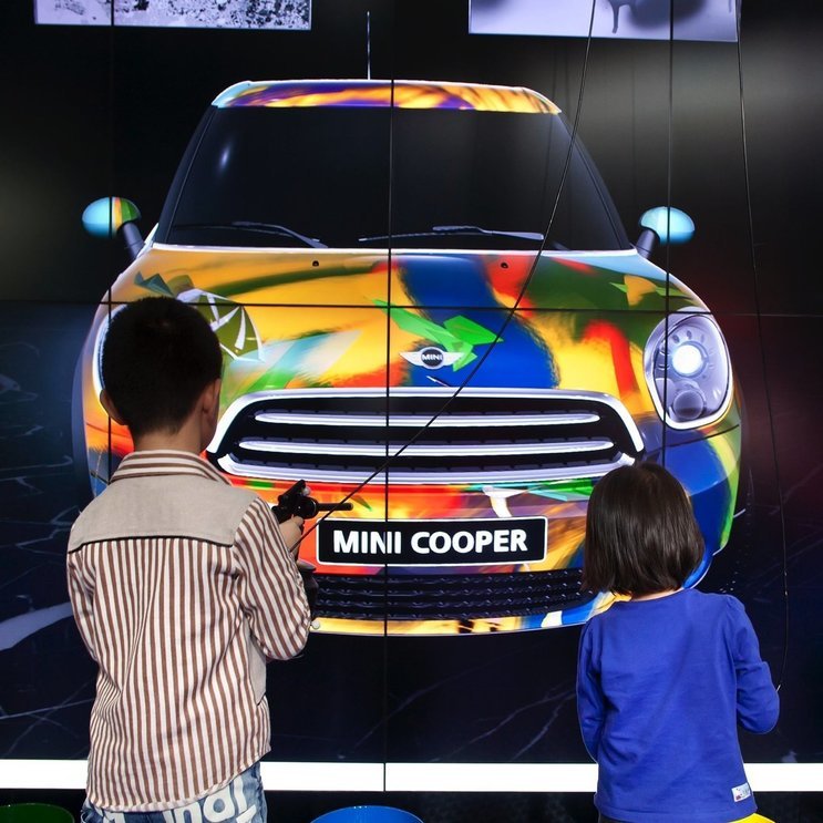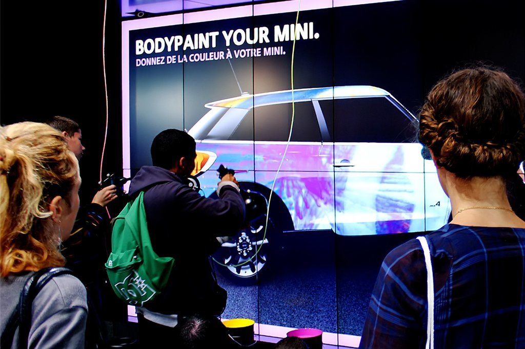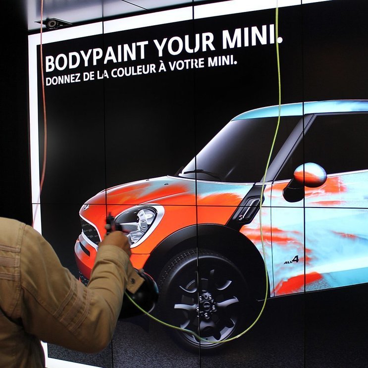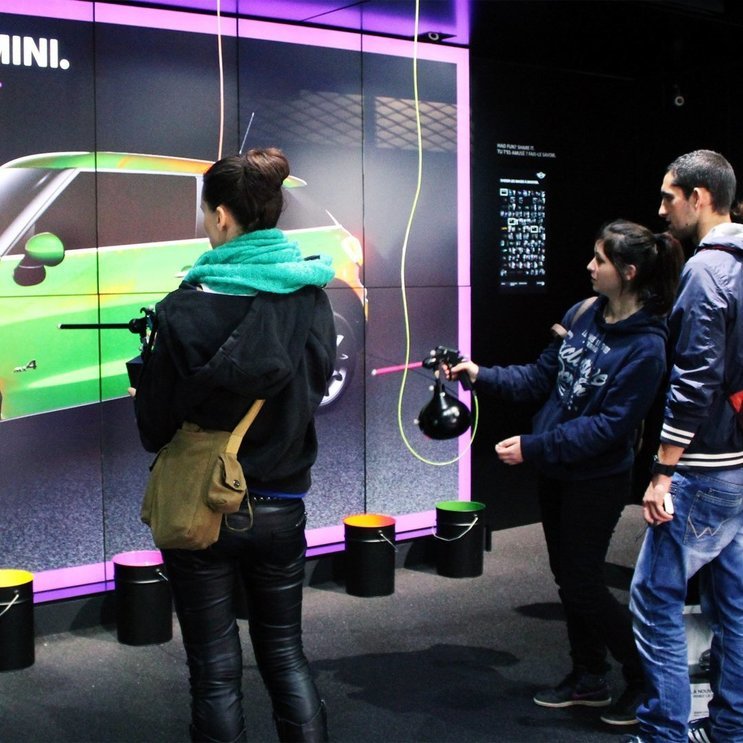 In July 2012 MINI commissioned us with an exhibit to “enable the visitor to feel and experience the brand values of MINI”. Based on an approach by Meiré und Meiré, we designed a highly interactive powerwall for collaboratively painting a virtual car with distinct movement behaviour. Refering to street-culture and fan-car workshops alike, visitors spray their personal MINI style. The realistic renderings by our real-time 3d engine can be shared via a social media integration.